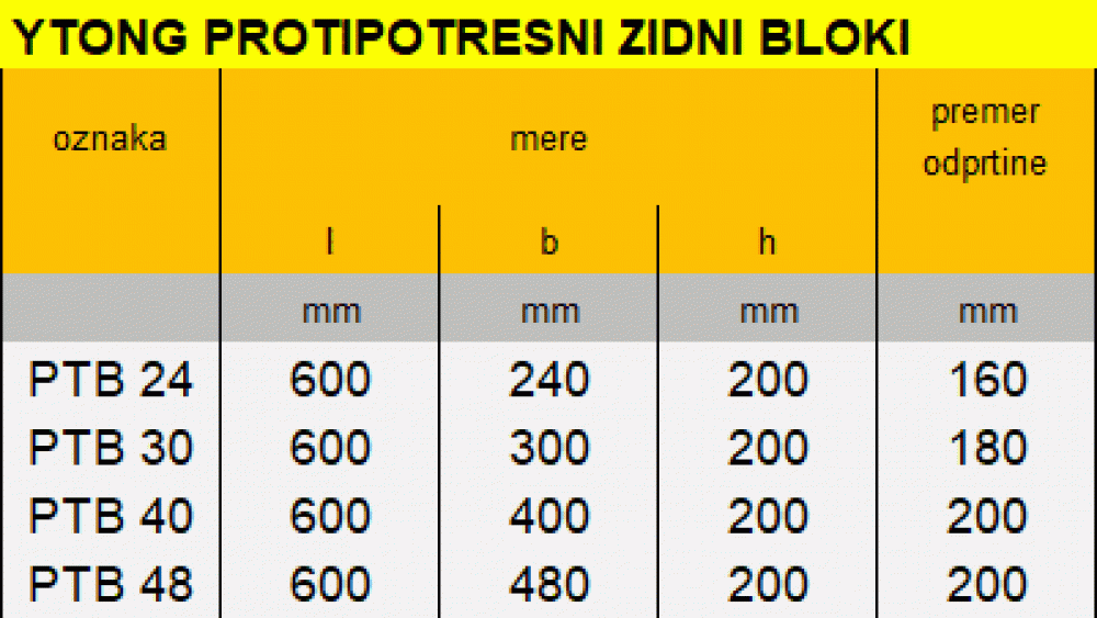 Namenjeni so izvedbi vertikalnih protipotresnih armiranih vezi na vogalih stavbe in pri vezavi notranjega nosilnega zidu na zunanji nosilni zid pri objektih P+3. Z njimi izvedemo vertikalno protipotresno vez tudi v ravnem zidu. Nadomeščajo opaž in toplotno izolacijo armiranobetonske vezi ter preprečijo nastanek toplotnih mostov. Ytong protipotresni zidni blok debeline 48 je namenjen izvedbi zelo dobre nizkoenergijske hiše skupaj z zidaki Ytong Termo Premium.